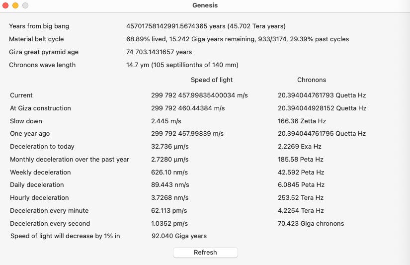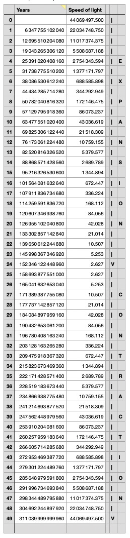 "Every dwindling away of a half-life thus creates its own hyperspace, whereby seven different hyperspaces or half life hyper spaces already exist in our universe which are further divided into countless more normal hyperspaces which have originated through the decline of the STEADILY FALLING light speed.” See the 1st spreadsheet."